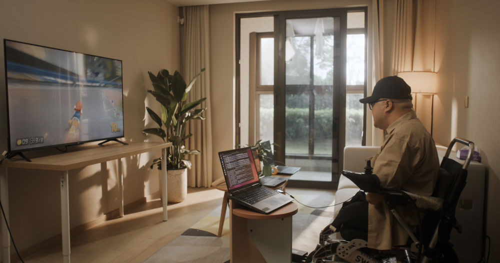 2025年4月30日,在位于上海的受试者住所,受试者通过脑机接口玩赛车游戏。新华社发(戴焱淼 摄)